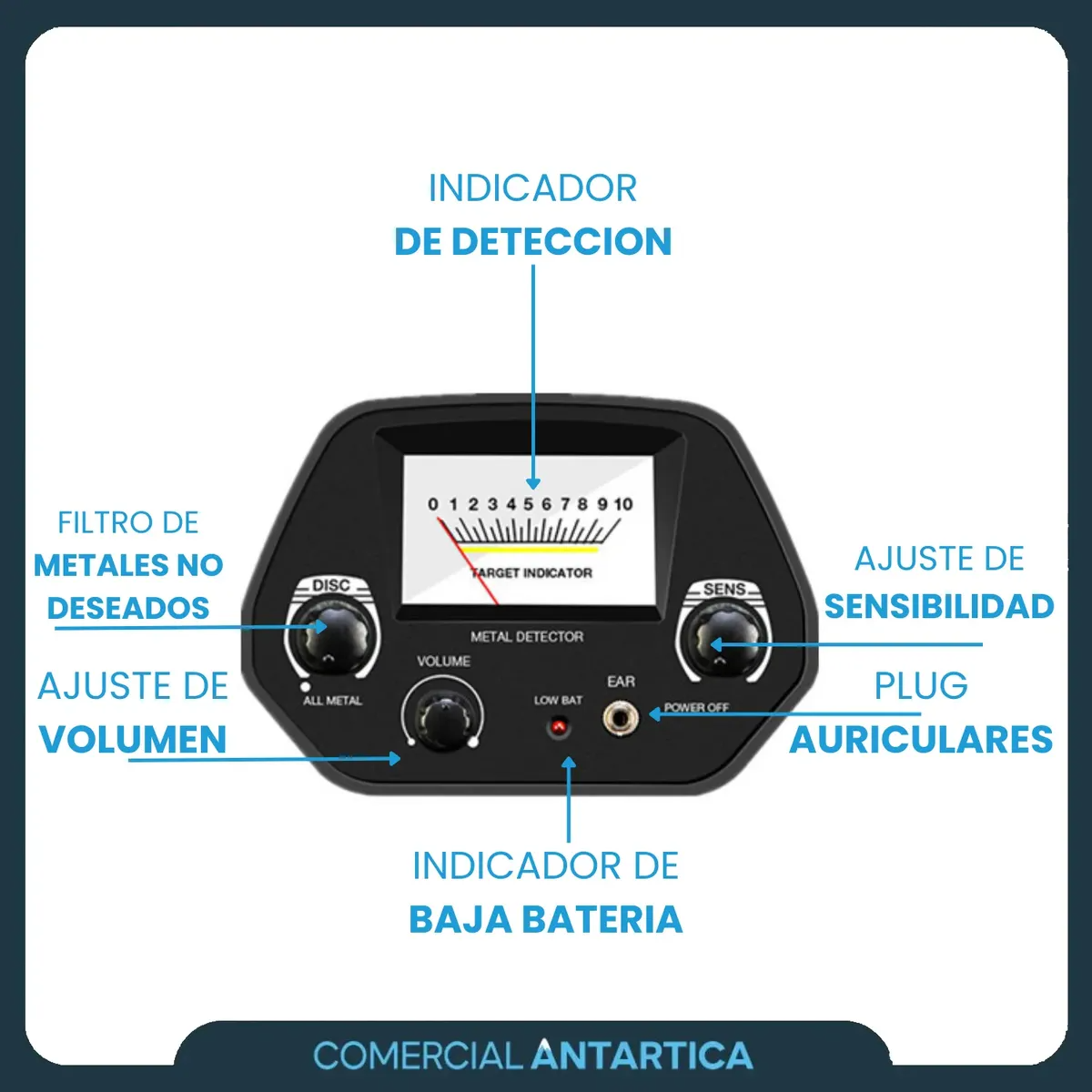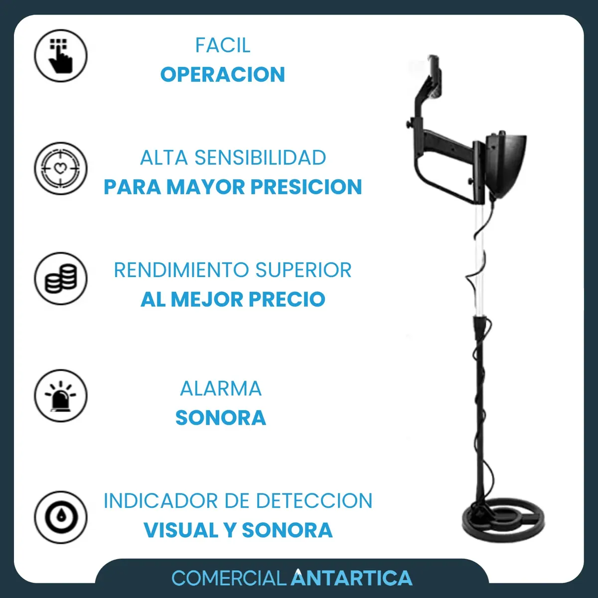 El detector de metales MD-4030 es una herramienta confiable y versátil para quienes buscan realizar detecciones de oro, plata, monedas, joyas y distintos tipos de metales tanto en superficie como en subsuelo. Su diseño ergonómico, sus funciones de discriminación y la bobina impermeable lo convierten en un compañero ideal para actividades en playa, campo, jardín o terrenos variados. Características principales El MD-4030 incorpora dos modos de búsqueda: All Metal y Discriminación (Disc), permitiendo identificar y filtrar distintos tipos de metales según la necesidad del usuario. Su frecuencia aproximada de 5 kHz proporciona un rendimiento estable, mientras que la bobina impermeable permite explorar sin inconvenientes en arena húmeda o en zonas de agua poco profunda. La sensibilidad regulable permite optimizar la detección según el entorno, ofreciendo un buen alcance que puede llegar hasta los 30 cm dependiendo del tamaño y tipo de objeto. El sistema de alerta combina señal sonora y medidor analógico, ofreciendo una lectura clara y fácil de interpretar. El equipo posee estructura telescópica ajustable, lo que garantiza comodidad para usuarios de distintas alturas y facilita su transporte. También cuenta con entrada para auriculares y funciona con dos baterías de 9V (no incluidas), asegurando un uso continuo y sostenido. Ideal para búsqueda de: Monedas, joyas de oro y plata, reliquias, objetos metálicos enterrados, tuberías, cables, piezas antiguas y distintos tipos de metales tanto en interiores como en exteriores. Es muy utilizado como detector de metales para playa, detector de metales para jardín y como buscador de tesoros underground. Contenido del producto – Detector de metales – Bobina impermeable – Manual de uso (según disponibilidad) Es un detector de metales confiable, preciso y cómodo, con funciones que permiten obtener resultados claros en distintos tipos de terreno. Su capacidad de discriminación, su estabilidad en la detección y la facilidad de uso lo convierten en una opción destacada para quienes desean buscar oro, plata, monedas u otros metales con un rendimiento sólido y consistente.